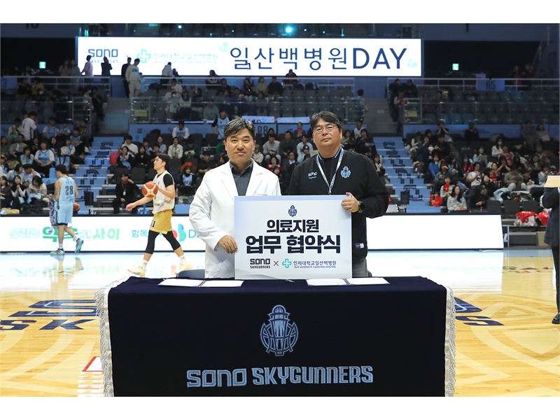 인제대학교 일산백병원(원장 최원주)이 고양시 프로농구단 소노 스카이거너스와 지정병원 및 의료지원 협약을 체결했다.협약식은 12월 9일 고양소노아레나(고양체육관)에서 열린 안양 정관장과의 경기 하프타임에 진행했다. 이날 행사에는 일산백병원 최원주 원장과 소노 스카이거너스 이기완 단장이 참석해 협약서에 공동 서명했다. 이번