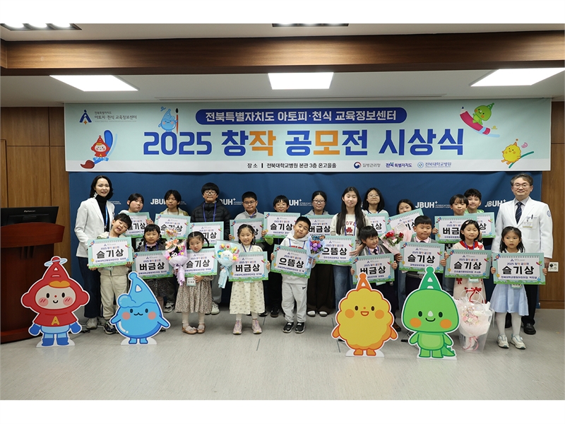 전북대학교병원(병원장 양종철)이 어린이와 청소년을 대상으로 알레르기질환에 대한 예방관리 중요성을 익히기 위해 마련된 ‘2025 창작공모전 시상식’을 개최했다고 15일 밝혔다.전북특별자치도 아토피·천식 교육정보센터(센터장 김소리)에서 주관한 이번 공모전은 올해 3회째를 맞았으며, 창의적 작품 활동을 통해 건강한 생활 습관을