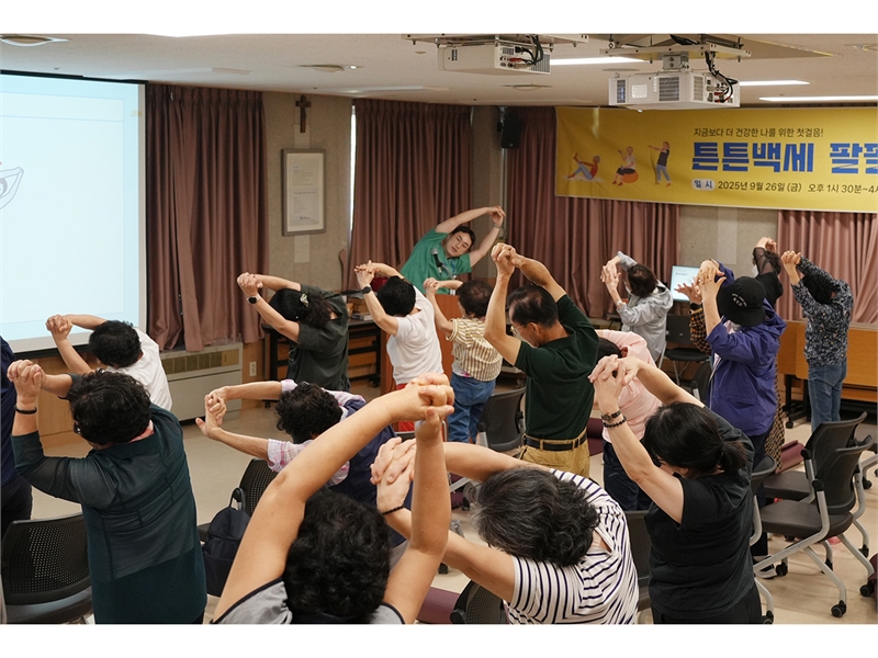 ▲가톨릭대학교 부천성모병원은 지난 9월 26일 근감소증 예방과 관리를 위한 ‘튼튼백세 팔팔근육’ 건강강좌를 개최했다. 사진은 참가자들이 프로그램 중 하나인 ‘전문가와 함께하는 운동실습’을 참여하고 있는 모습.