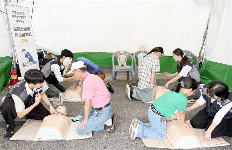 ▲가톨릭대 인천성모병원, 부평풍물대축제서 심폐소생술 체험 부스 운영