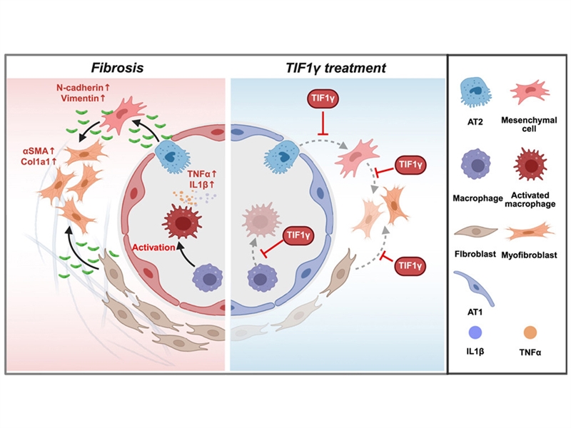 ▲폐 섬유증 악화 및 차단 기전. TIF1γ 유전자는 대식세포 흥분 단계, 간엽세포 형질전환 단계, 섬유모세포 활성화 단계에서 모두 차단효과를 발휘함.