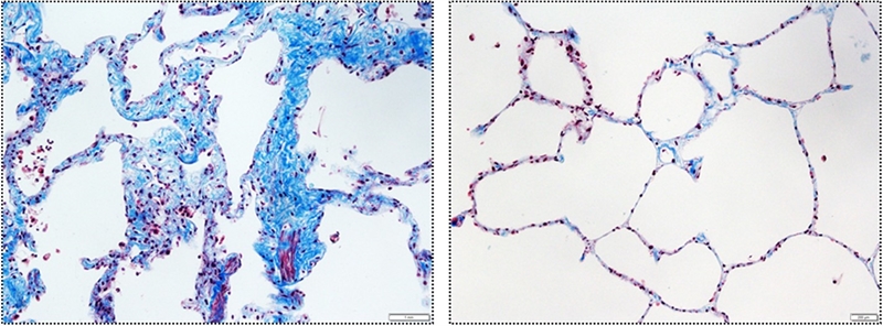 ▲체외배양 인간 폐 조직 분석. TIF1γ 적용 후 섬유화로 인한 콜라겐 침착(파란색)이 감소되고 폐포의 구조가 유지됨.