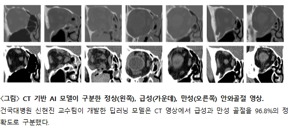 건국대병원 안과 신현진 교수팀이 안와 골절 진단과 분류를 위한 딥러닝 모델을 개발해 골절 검출에서 99.5%의 정확도를 달성하는 연구 성과를 국제학술지에 발표했다. 특히 급성 골절과 만성 골절을 구분할 수 있는 AI 모델을 개발해 치료 계획 수립에 유용한 정보를 제공할 것으로 기대된다.