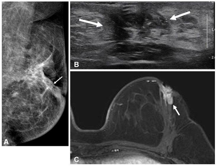 ▲수술 전 MRI 검사를 시행하지 않은 50세 이하 환자의 수술 2년 후 유방 영상 검사 결과. 동측 유방 내 재발이 발생함. (A)유방촬영술 (B)유방초음파 (C)MRI