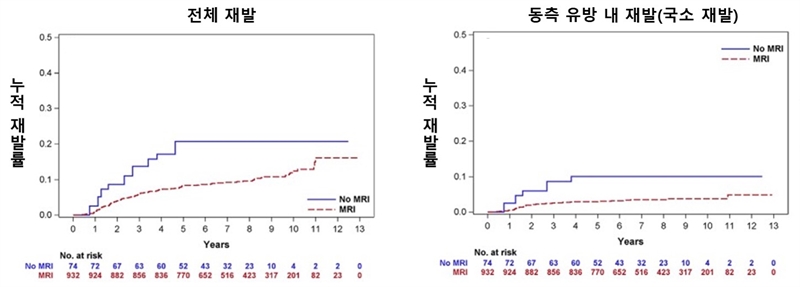 그 결과, 전체 재발률은 MRI군과 비MRI군에서 차이가 없었으나, 동측 유방 내 재발률은 MRI군이 유의미하게 낮았다(1.6% vs 3.3%).