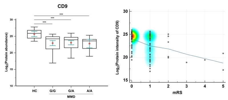 ▲[그림2] CD9 단백질 발현에 따른 예후 비교. 모야모야병 환자군은 대조군 대비 신생 혈관 형성을 촉진하는 CD9 발현이 낮았다. 환자군 내에서는 CD9 발현이 높을수록 mRS가 낮은 좋은 예후를 보였다.
