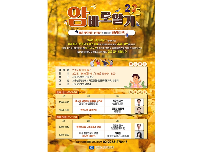 가톨릭대학교 서울성모병원 암병원이 오는 11월 10일부터 11일까지 이틀간 본관 지하 1층 대강당에서 ‘2025년 암 바로알기 – 암병원과 함께하는 힐링여행’ 을 개최한다.