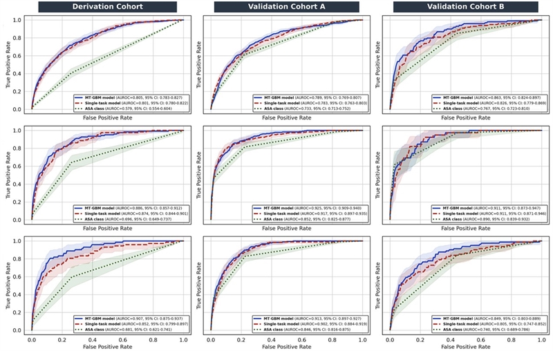 ▲[자료] 수술 후 합병증 예측 정확도(AUROC). 연구팀이 개발한 MT-GBM 모델(파란색)은 급성신손상, 호흡부전, 입원 중 사망 예측에 있어 모든 코호트에서 단일 예측 모델(빨간색) 및 ASA 분류 기준(초록색)보다 일관되게 우수한 예측력을 보였다.