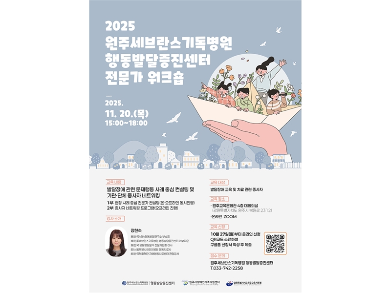 원주세브란스기독병원 발달장애인 거점병원·행동발달증진센터(센터장 이진희)가 11월 20일 원주교육문화관에서 발달장애인 관련 교사, 치료사, 사회복지사 등 유관 기관 종사자를 대상으로 전문가 워크숍을 실시한다.