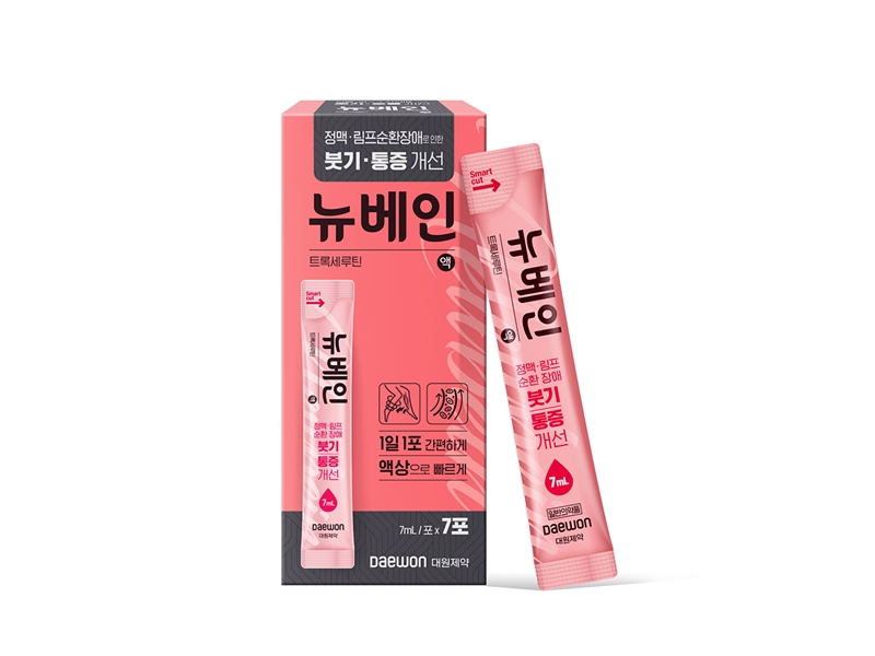 대원제약(대표 백승열)은 짜 먹는 정맥·림프순환개선제 ‘뉴베인액’의 7포 패키지가 소매용에 이어 도매용으로도 출시됐다고 13일 밝혔다.