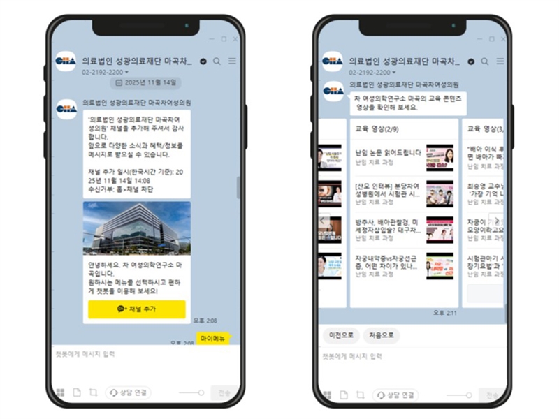 마곡 차병원 난임센터 환자들은 케어챗에서 ▲시술 일정 및 절차 안내 ▲난임 치료 및 생활습관 교육 콘텐츠 시청 ▲진료비 간편 결제 등 다양한 서비스를 24시간 언제든지 편리하게 이용할 수 있다. 모바일 카카오톡에서 ‘마곡차여성의원’ 채널을 검색해 추가한 뒤, 케어챗 간편 가입을 완료하면 관련 서비스를 이용할 수 있다.