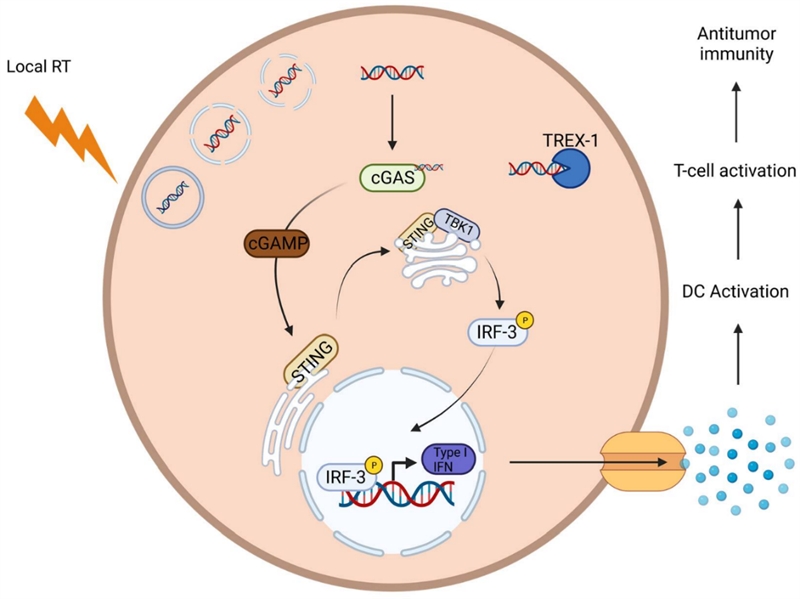 방사선치료(RT, 번개 그림으로 표시)는 세포질 DNA(cytosolic DNA)의 방출을 유도한다. DNA는 cGAS(cyclic GMP-AMP synthase)에 의해 감지되며, cGAS는 cyclic GMP-AMP(cGAMP)를 생성한다. 생성된 cGAMP는 소포체(endoplasmic reticulum)에 위치한 STING(stimulator of interferon genes)에 결합하여 이를 활성화시킨다.