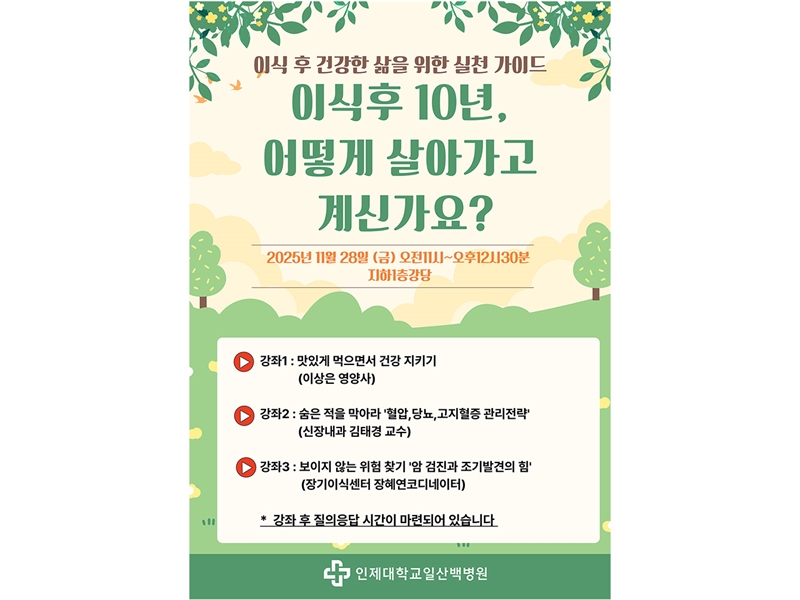 이번 행사는 11월 28일(금) 오전 11시, 일산백병원 지하 1층 대강당에서 열린다. 장기이식 후 건강한 삶을 유지하기 위한 실천 전략을 주제로, 전문 의료진이 강의를 진행한다.