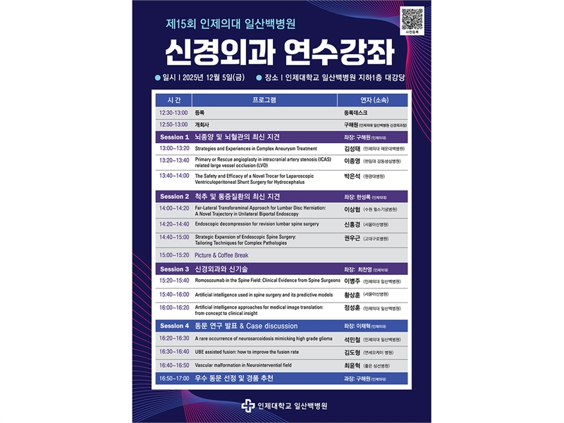 인제대학교 일산백병원이 오는 12월 5일(금) 병원 지하 1층 대강당에서 신경외과 전문의를 대상으로 ‘제15회 신경외과 연수강좌’를 개최한다. 이번 연수강좌는 뇌종양과 뇌혈관 치료, 척추 질환 최소침습 수술, 인공지능(AI) 기반 융합 의료기술 등 신경외과 분야의 최신 치료 트렌드와 임상 경험을 나누기 위해 마련했다.