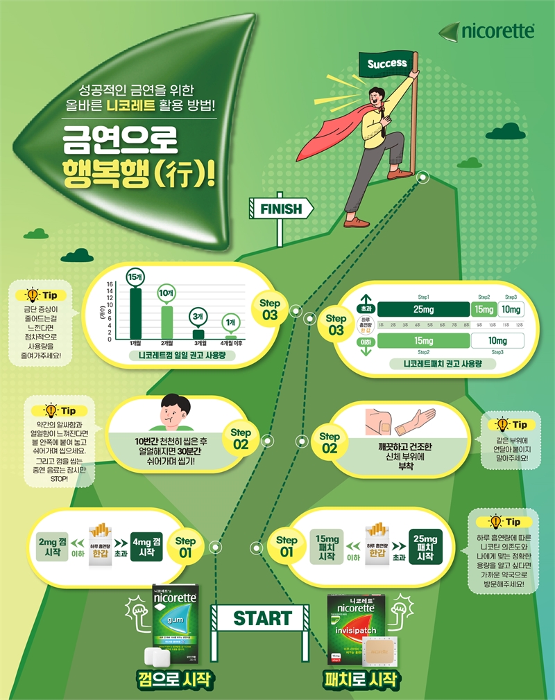 또한 캠페인에서는 성공적인 금연을 위한 니코레트의 올바른 사용법을 중점적으로 알린다. 니코레트를 처음 사용할 때에는 개인의 니코틴 의존도에 따라 적절한 초기 용량을 설정해야 하며, 껌과 패치 제형 별로 정해진 복용법과 부착법을 준수해야 효과적으로 금단증상을 치료할 수 있다. 평소 1일 흡연량이 궐련 20개비(한 갑) 미만일 경우에는 2mg껌을 하루 기준 8~12개를 사용하고, 20개비(한 갑) 이상 흡연하거나, 2mg용량으로 금단증상 개선이 어려울 시, 용량을 올려 4mg을 하루 8개에서 12개 사용하는 것이 권고된다. 니코레트 인비지패취 역시 10mg, 15mg, 25mg의 3가지 용량이 있어 개인의 니코틴 의존도에 맞춰 용량을 선택 후 사용하면 된다.
