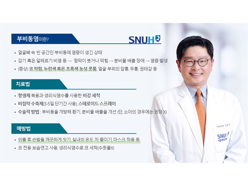 김동영 교수(이비인후과)는 “부비동염을 예방하려면 마스크 착용과 손 씻기 등 기본적인 위생수칙을 지키고, 코 점막이 건조하지 않도록 관리하는 것이 중요하다”며 “노란 콧물이나 후비루가 나타나거나 기침이 3주 이상 지속되면 조기에 전문 진료를 받아 합병증을 막아야 한다”고 강조했다.