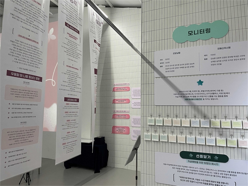활동보고회 전시 공간에는 서포터즈의 전체 활동 과정을 구조적으로 정리한 ‘142일간의 여정지도’가 설치됐다. 발대식에서 시작된 8개의 청년 현안, 이후 만들어진 58개의 자기돌봄 실천 계획, 팀별 결과물이 시간 순서대로 배치되면서 청년이 스스로 설계한 자살예방 실천이 어떤 방식으로 축적됐는지 시각적으로 드러났다. 또한 앞서 서술한 모니터링팀의 자살·자해 유해매체 대응 과정, 홍보팀이 기록한 감정 텍스트와 ‘마음채움 문장집’ 제작 과정, 인터뷰 기록 등이 함께 전시되며 하나의 이야기로 연결됐다.