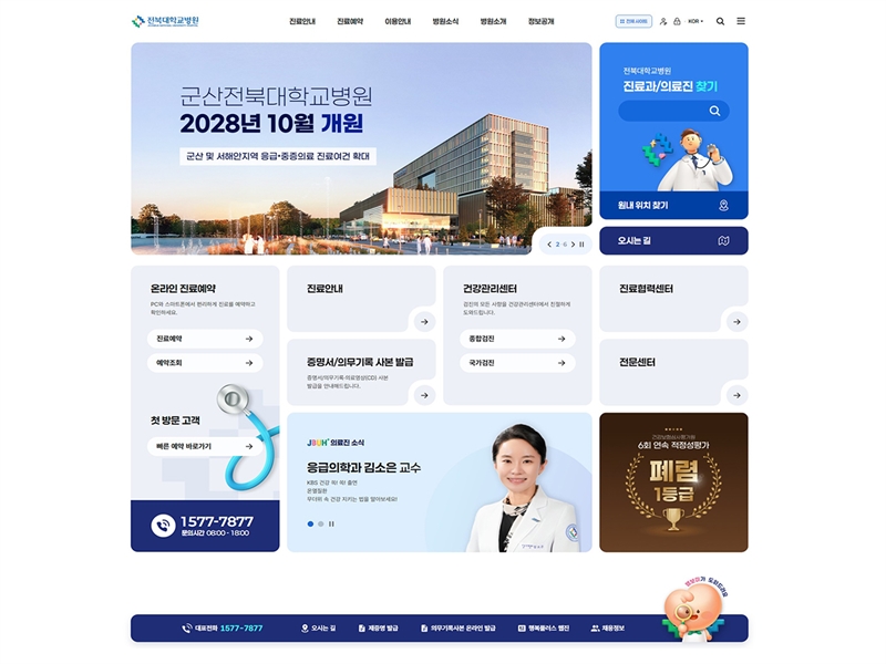 한편 전북대병원 홈페이지(https://www.jbuh.co.kr)는 대표 홈페이지를 포함해 22개 세션으로 구성됐으며, 최신 웹디자인과 사용자 경험을 반영해 병원 주요 기능을 쉽고 빠르게 이용할 수 있도록 편의성을 강화했다. 또한 환자 개인정보 보호를 위해 최신 보안 인증체계를 적용하는 등 안전한 디지털 환경을 제공하고 있다.