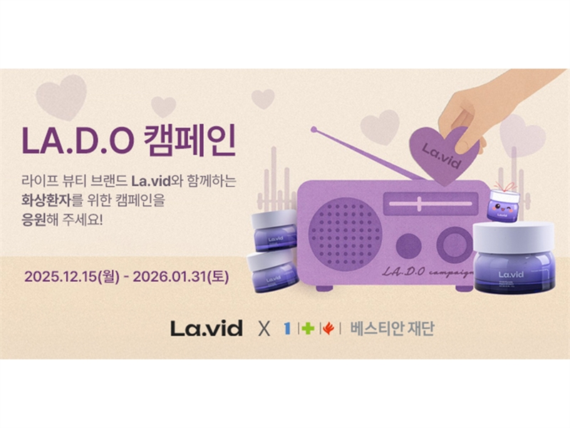 (재)베스티안재단 사회복지사업본부(대표 설수진)는 주식회사 더에스티글로벌이 전개하는 화장품 브랜드 라비드(La.vid)(대표 김민재)와 함께 화상환자 기부 캠페인 ‘LA.D.O’를 진행한다고 밝혔다.