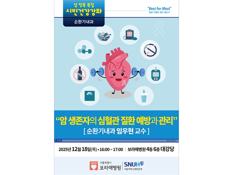 올해의 마지막 강의로 진행될 ‘암 생존자의 심혈관 질환 예방과 관리’는 순환기내과 임우현 교수가 강의할 예정이며, 직접 방문이 어려운 분들은 보라매병원 유튜브 채널인 “서울대 보라매병원”을 통해 확인할 수 있다.