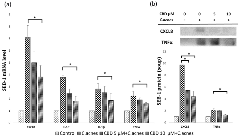 그 결과, CBD는 피지세포의 활성을 억제하고 농도 증가에 따라 세포 사멸을 유도하는 양상을 보였다. 특히 고농도 조건에서는 세포 사멸이 나타나는 영역이 증가했다. 또한 여드름 유발균인 큐티박테리움 아크네스(C.acnes)로 염증을 유도한 세포에서는 CXCL8, IL-1α, IL-1β 등 염증 신호물질의 발현이 감소한 것으로 나타났다.