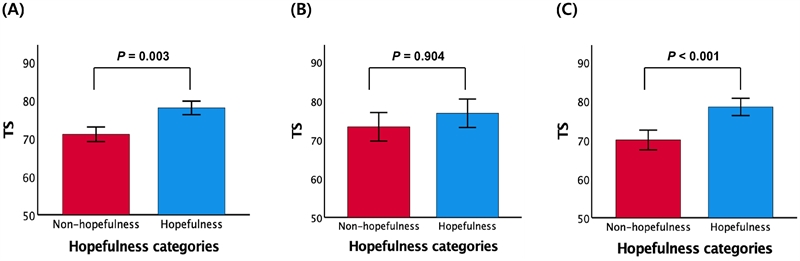 (A) 희망감 그룹(파란색 막대)이 비희망감 그룹(빨간색 막대)보다 인지기능 점수에서 우위를 나타냈다.