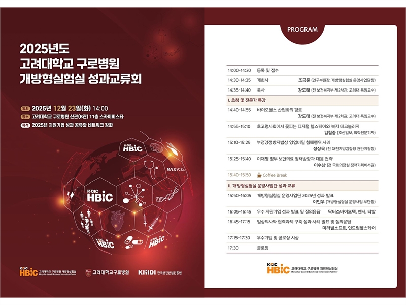 고려대학교 구로병원(병원장 민병욱) 개방형실험실 운영사업단(단장 조금준 연구부원장)이 오는 12월 23일(화) 본원 스카이비스타에서 2025년 고려대학교 구로병원 개방형실험실 성과교류회를 개최한다.