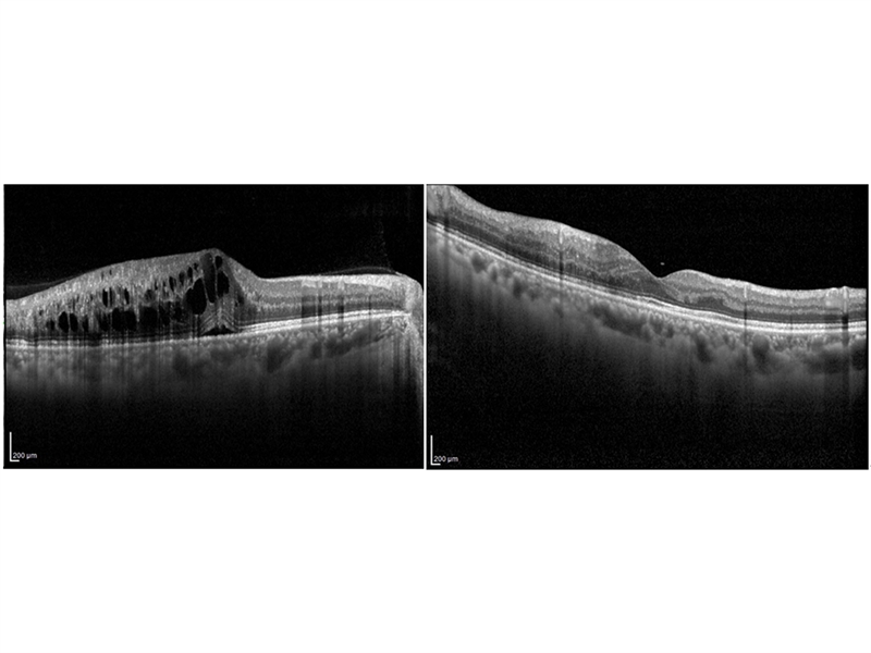 ▲(좌) 항혈관내피성장인자 항체 주사치료 전 (우) 항혈관내피성장인자 항체 주사치료 후 황반부종이 호전된 소견 (출처 김안과병원)