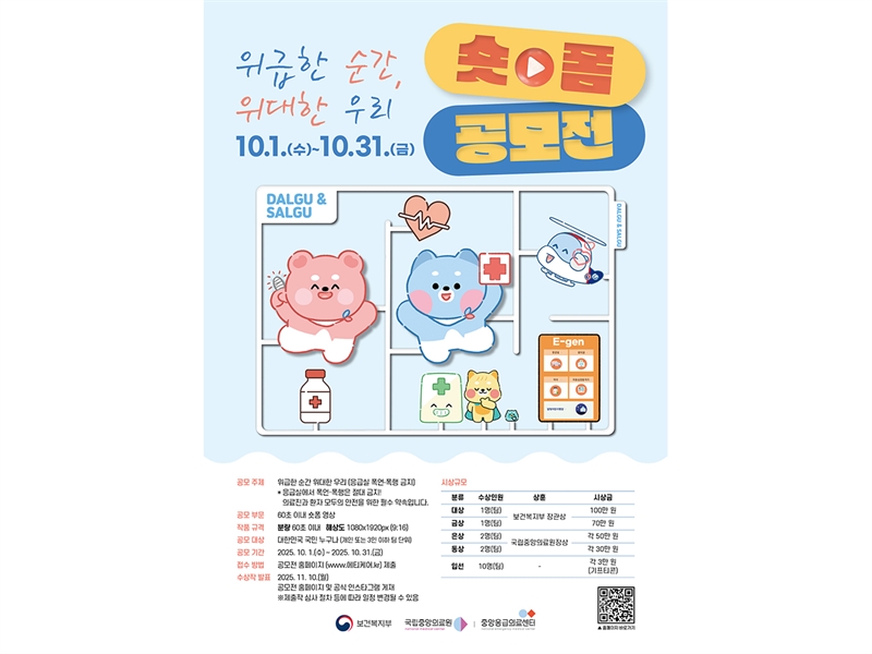 국립중앙의료원(원장 서길준) 중앙응급의료센터는 응급실 내 폭언·폭행 금지를 위한 국민 참여 숏폼 영상 공모전 「위급한 순간, 위대한 우리」를 10월 1일(수)부터 31(금)까지 개최한다.이번 공모전은 10월 한 달간 운영되는 ‘제4회 응급의료 주간’의 대표 프로그램으로써, 응급실 이용 문화를 개선하고 응급의료 현장에서 발