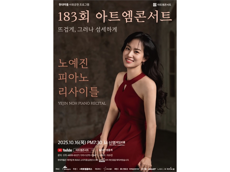 현대약품이 오는 10월 16일 서울 영등포구 신영체임버홀에서 제183회 아트엠콘서트 ‘노예진 피아노 리사이틀 : 뜨겁게, 그러나 섬세하게’를 개최한다. 이번 아트엠콘서트 무대의 주인공인 노예진 피아니스트는 예원학교와 서울예술고등학교를 거쳐, 서울대학교 음악대학을 전체 수석으로 졸업한 재원으로, 이후 인디애나 음대에서 석