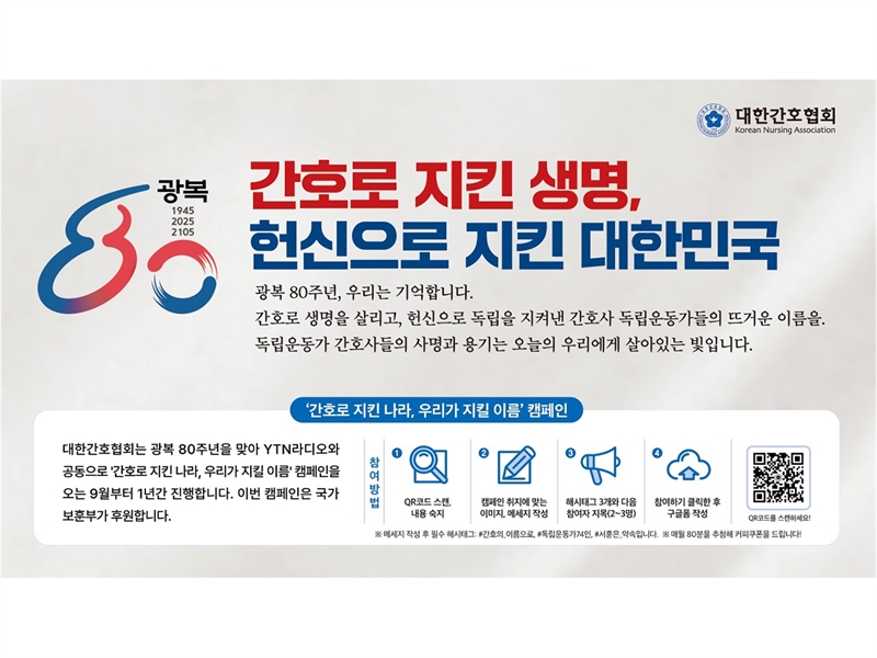 대한간호협회가 광복 80주년을 맞아 독립운동에 헌신한 간호사들의 업적을 대국민적으로 알리는 캠페인을 진행 중이다.간호협회는 지난 9월 1일부터 ‘간호로 지킨 나라, 우리가 지킬 이름’ 캠페인을 시작했다. 이번 캠페인은 일제강점기 독립운동에 헌신하고도 아직 정부 서훈을 받지 못한 간호사들의 명예 회복과 역사적 재평가를 목표