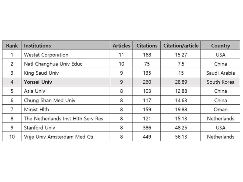 연세대학교 간호대학이 환자안전문화 분야 우수한 연구역량을 인정받았다.국제학술지 ‘환자안전지(Journal of Patient Safety)’ 최근호 연구에 따르면 연세대학교는 2001~2023년에 환자안전 연구 9편을 게재하며 발표 건수 기준 세계 4위에 올랐다. 논문당 평균 피인용수를 기준했을 때는 세계 3위다. 이중