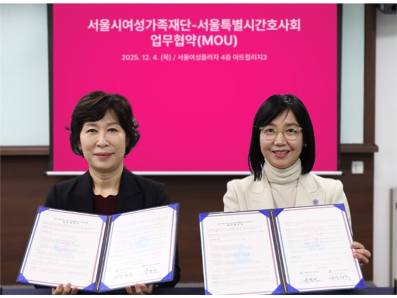 서울특별시간호사회(회장 박정선)는 12월 4일 서울시여성가족재단 (대표이사 박정숙)과 영유아·아동의 건강권 보호 및 보건·간호 분야의 양성평등 조직문화 확산을 위한 업무협약(MOU)을 체결했다고 밝혔다.이번 협약은 급변하는 돌봄·보건환경 속에서 영유아와 아동의 건강과 발달을 보다 체계적으로 지원하고, 간호전문성과 양성평등