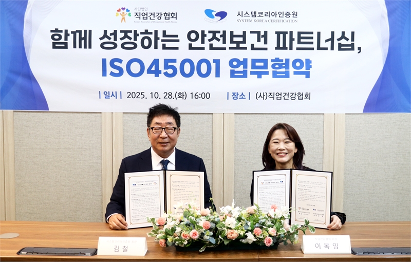 한국직업건강간호협회(회장 이복임, 이하 직업건강협회) 교육센터는 10월 28일(화), 서울 서초구 직업건강협회 본부 회의실에서 시스템코리아인증원(원장 김철)과 ‘ISO45001 자격과정 운영 업무협약(MOU)’을 체결했다.이번 협약은 산업현장의 안전보건관리 역량을 높이고, 국제표준 ISO 45001(안전보건경영시스템) 자