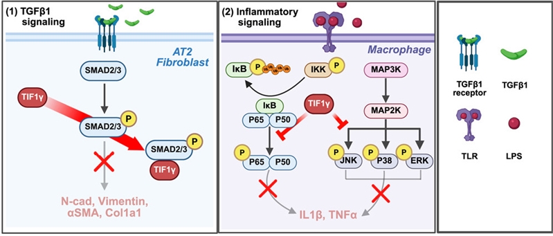 ▲TIF1γ 유전자의 섬유화 차단 기전. (1)TIF1γ는 AT2 세포와 섬유모세포에서 TGF-β 신호를 차단하고, (2)대식세포에서 염증 신호 경로(NF-kB, MAPK)를 복합적으로 차단하여 강력한 효과를 보임.