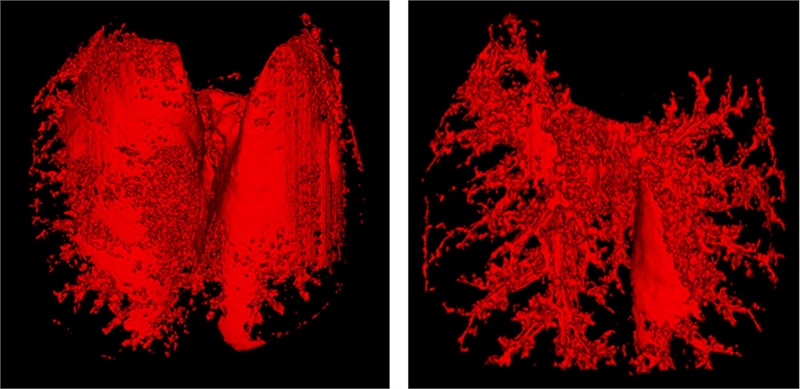 ▲미세CT 기반 동물 폐조직 분석. TIF1γ 적용 후 섬유화 영역(빨간색)이 감소함.