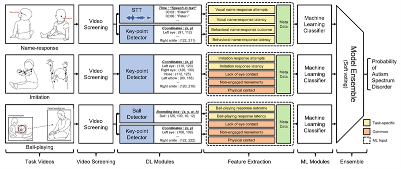 ▲[그림] AI 기반 자폐스펙트럼장애 조기 선별 과정: 이름 반응, 모방, 공놀이 영상을 분석해 음성·자세·공 움직임을 행동 지표로 변환하고, 이를 종합해 자폐 가능성을 예측한다.