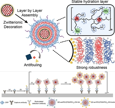 이 나노복합체는 기존 동일 연구진에서 발표한 양친매성 고분자(물과 기름 성질을 모두 가진 고분자) 기반의 나노복합체보다 구조적으로 단단하고 빛의 신호도 더 안정적이다. 이는 ‘층상 자기 조립(Layer-by-layer self-assembly)’이라는 독창적 방식을 적용해, 외부 물질로 인해 신호가 약해지는 현상(형광 소광)을 최소화했기 때문이다. 이 기술을 통해 연구팀은 나노입자의 표면 화학 구조를 정밀하게 조절하며, 생체분자(비오틴, 스트렙타아비딘 등)를 표면에 도입하고 이들과의 상호 결합력을 극대화시켰다.