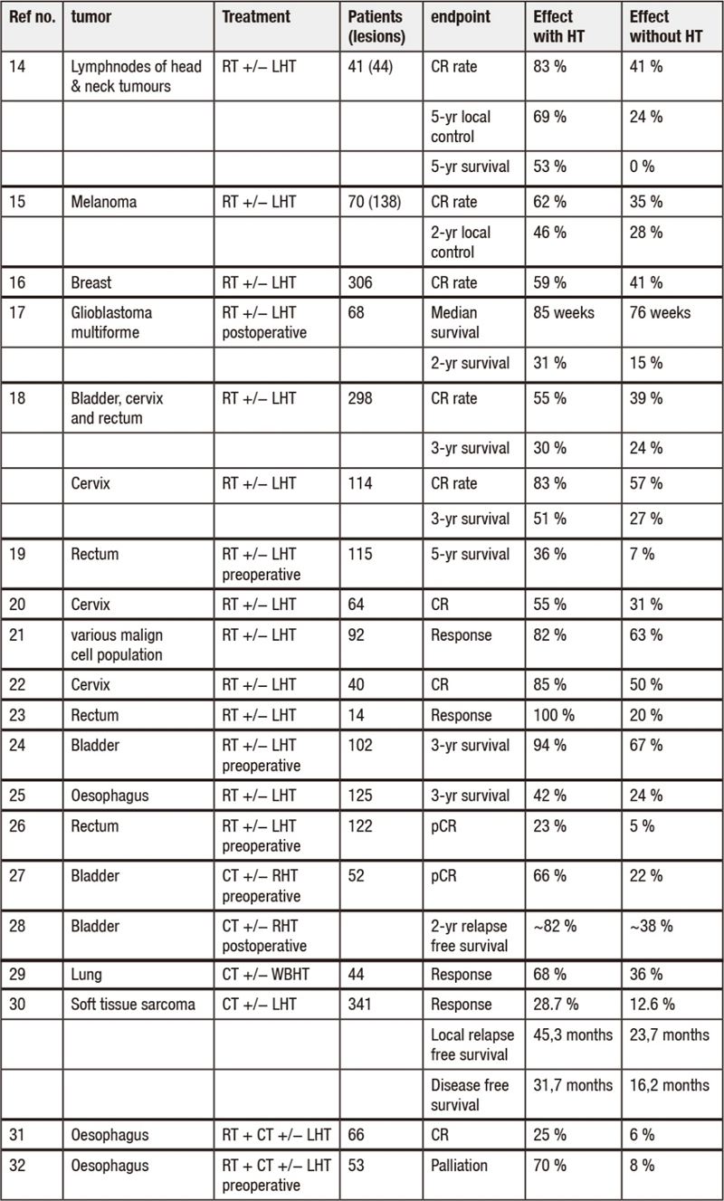 무작위 연구들에서, 온열 요법을 병용한 연구군은 생존율, 질병 진행까지의 기간, 질병 진행률 및 관해율(완전 관해 또는 부분 관해) 측면에서 현저히 향상된 결과를 보였다. 특히, 방사선 치료(RT), 화학 요법(CT), 또는 화학-방사선 병용 치료에 온열치료(HT)를 병행한 경우, 동일한 치료를 온열요법 없이 시행했을 때보다 통계적으로 유의한 개선 효과가 관찰되었다.