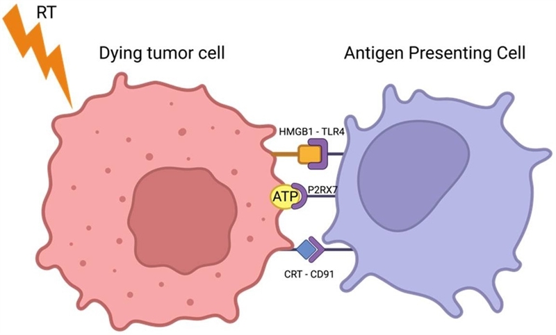 방사선치료(RT, 번개 그림으로 표시)는 종양세포로부터 ATP, 칼레티큘린(CRT), 고이동성 그룹 박스 1(HMGB1)의 발현을 유도한다. 방출된 DAMPs(손상 관련 분자 패턴)는 면역세포 표면의 퓨린 수용체(purinergic receptors)에 결합하여 신호 전달 경로(signaling cascade)를 활성화한다. 이 경로는 면역세포가 종양세포를 인식하고 반응하는 능력을 향상시키며, 이러한 상호작용은 면역세포가 종양 미세환경으로 활성화되어 유입되는 데 핵심적인 역할을 한다. 결과적으로 항종양 면역 반응이 증대된다.