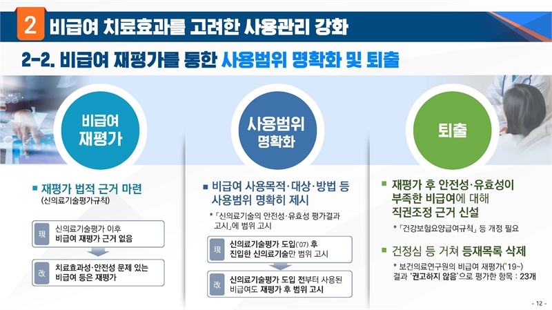 이에 따라 보건당국은 신의료기술평가에 관한 규칙[보건복지부령 제1098호]을 2025년 3월 6일 일부 개정하고, 동 규칙에 제4조 3을 신설하였으며 이 조항에 따라 비급여에 대한 재평가 및 비급여 목록 삭제를 통해 ‘해당 비급여 의료기술은 2025년 9월 7일자로 퇴출시킨다’는 방침을 세웠다. [차트 1 참조]