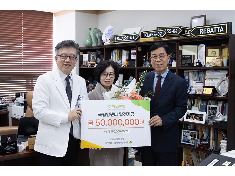 국립암센터(원장 양한광)는 12월 10일(수) ㈜에스씨엘 이상춘 회장이 국립암센터 발전을 위해 기부금 5천만 원을 전달했다고 밝혔다.