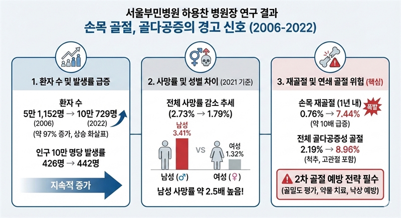 하 병원장은 국민건강보험 청구자료를 활용해 2006년부터 2022년까지 50세 이상 성인의 손목 골절 발생률, 사망률, 이후 발생하는 추가 골절 위험을 장기간 분석했다.