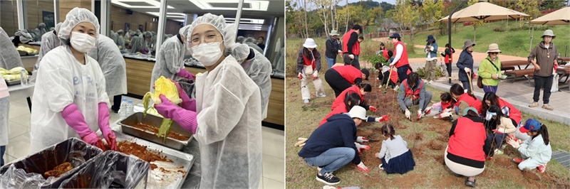▲한미그룹 임직원들의 ‘사랑의 김장김치 나눔 봉사’(왼쪽)와 ‘한미 녹색숲’ 조성 모습
